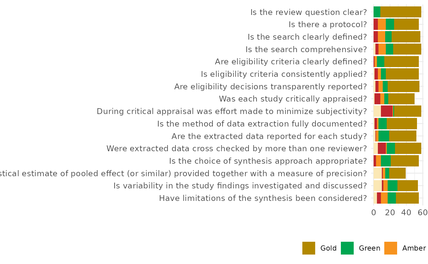plot_CEESTAT.RdThis function creates a horizontal stacked bar chart (like the one used in systematic review. It is designed to visualize categorical appraisal CEESTAT results (e.g., Gold, Green, Amber, Red, N/A) across multiple review criteria.